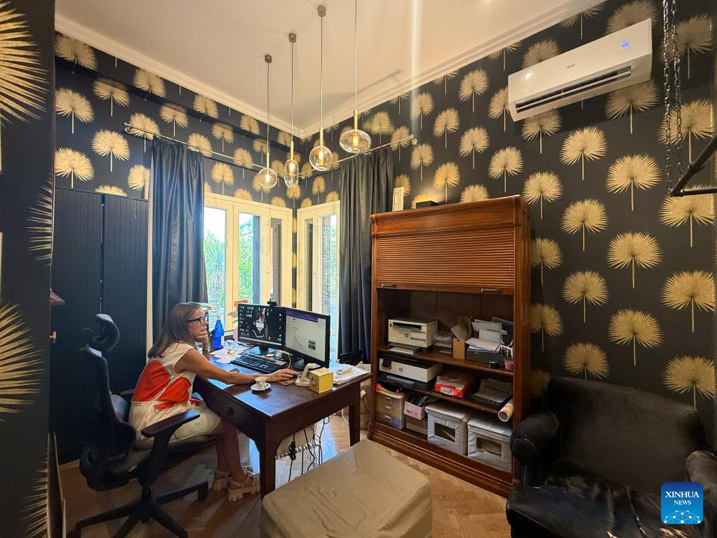 Lesley Venditti, CEO of Lesley Luxury Vintage company, works at her studio with a new air conditioner of Chinese brand Haier, in Rome, Italy, on July 24, 2025. Chinese brands like Midea, Hisense and Skyworth told Xinhua that sales of cooling white goods rose across Europe this summer, as consumers increasingly embrace their portability, advanced features, and reliable service. (Xinhua/Li Jing)