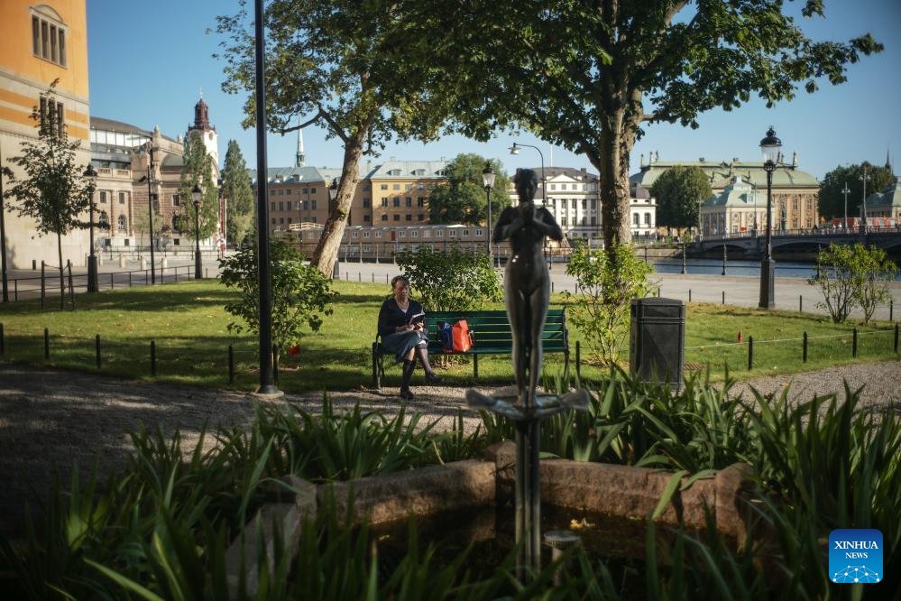 A woman basks in the sun in Stockholm, Sweden on July 27, 2025. (Xinhua/Peng Ziyang)