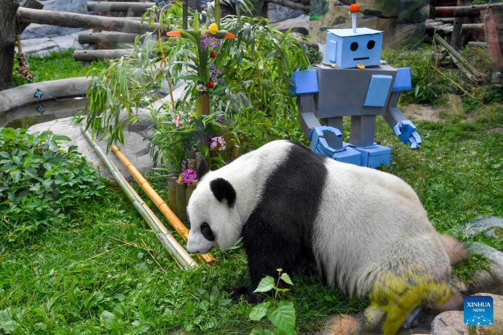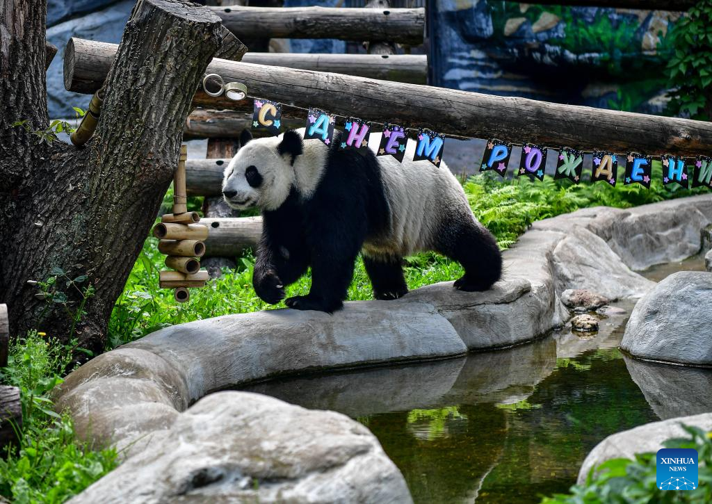 Giant panda Dingding walks under birthday decorations at the Moscow Zoo in Moscow, Russia, on July 30, 2025. The Moscow Zoo held an event to celebrate giant panda Dingding's eighth birthday on Wednesday. (Xinhua/Zhang Chaoqun)