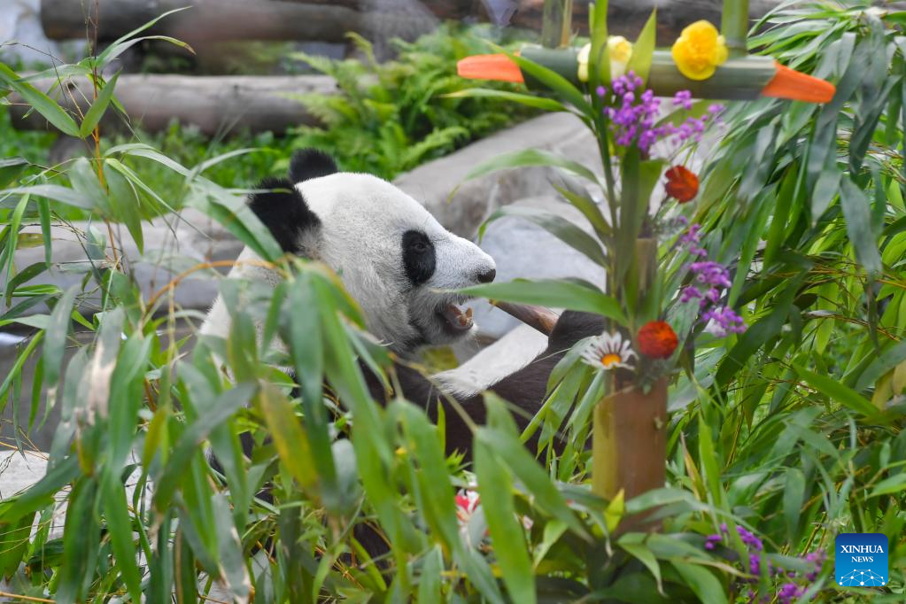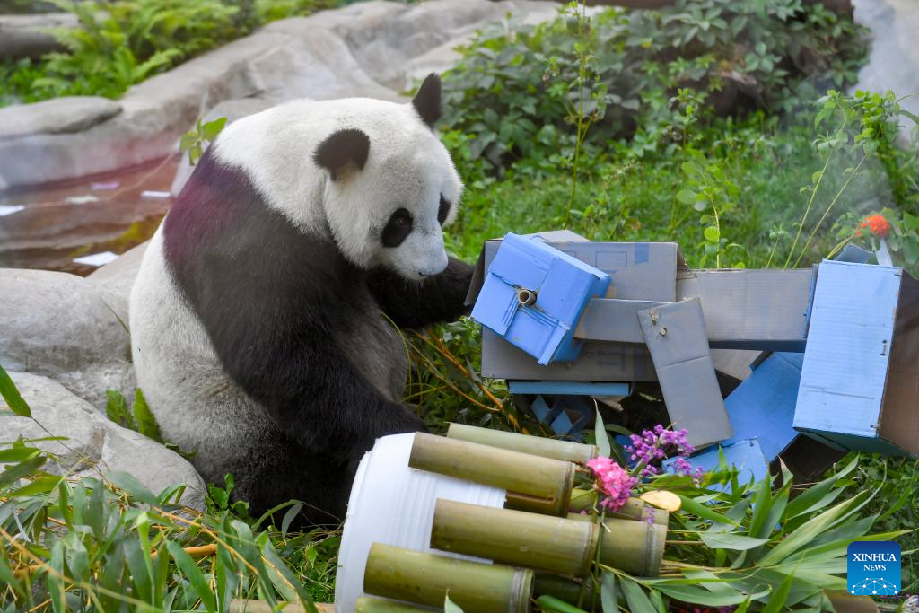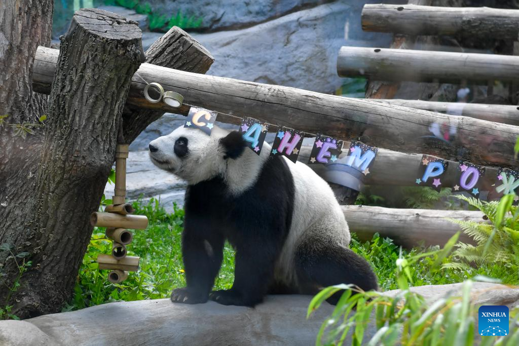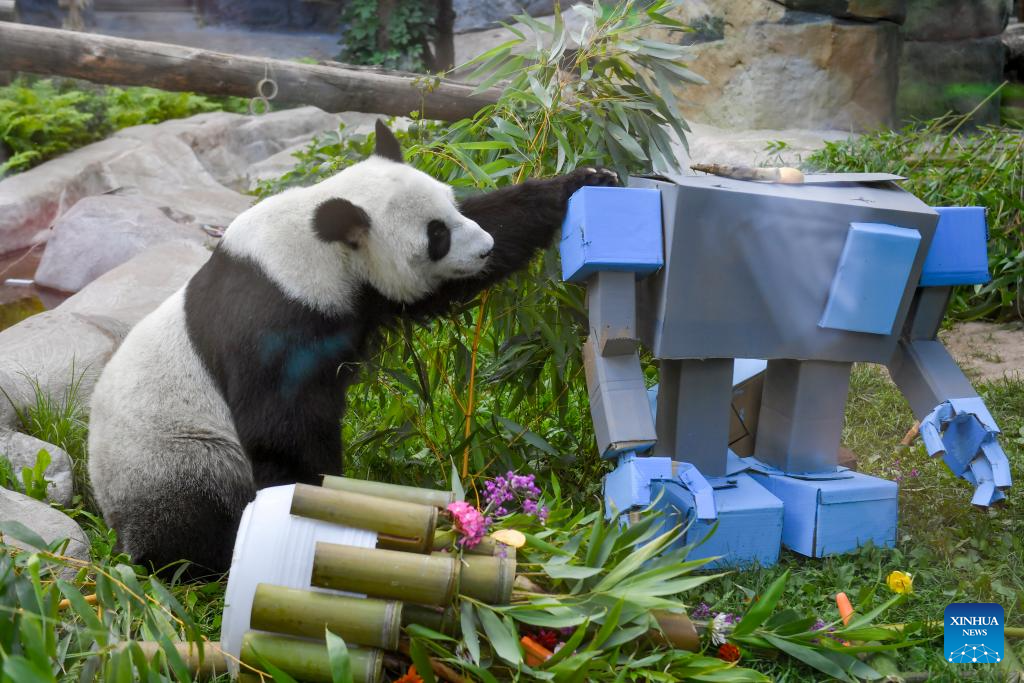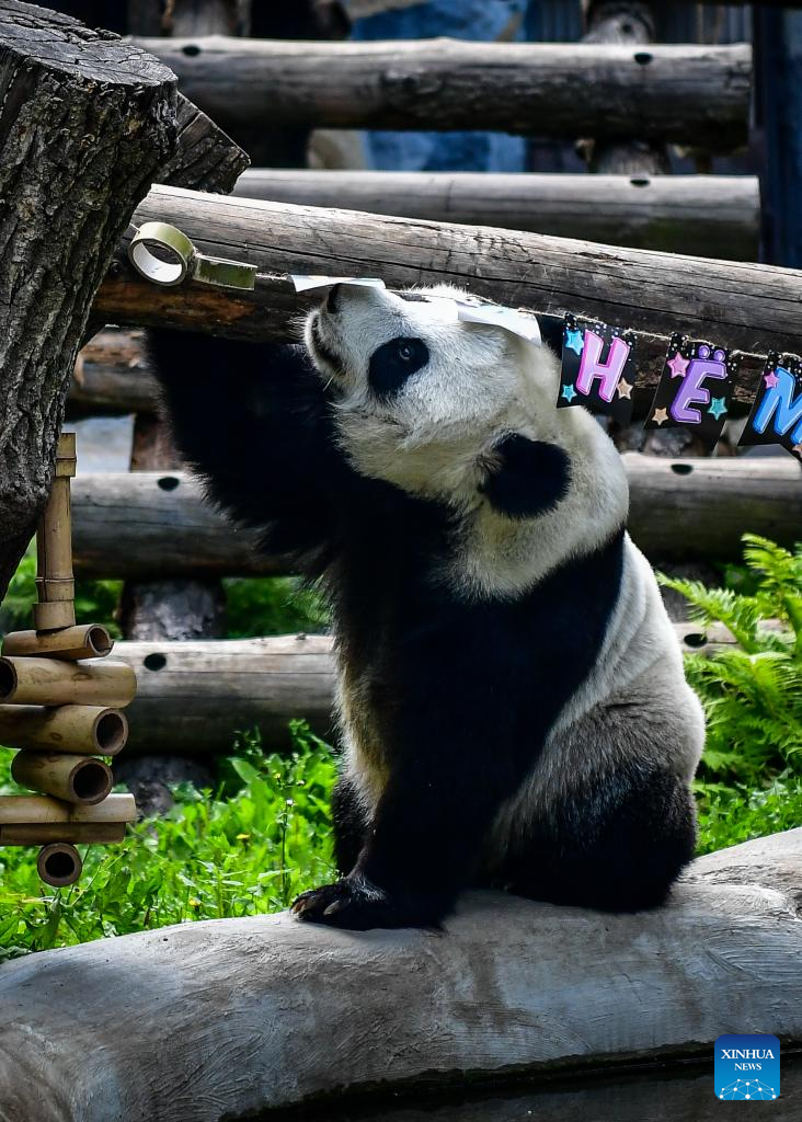 Giant panda Dingding plays under birthday decorations at the Moscow Zoo in Moscow, Russia, on July 30, 2025. The Moscow Zoo held an event to celebrate giant panda Dingding's eighth birthday on Wednesday. (Xinhua/Zhang Chaoqun)