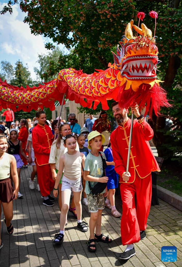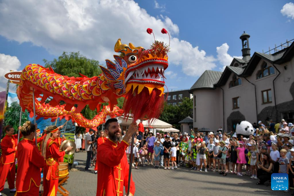 People perform a lion dance during an event for giant pandas at the Moscow Zoo in Moscow, Russia, on July 30, 2025. The Moscow Zoo held an event to celebrate giant panda Dingding's eighth birthday on Wednesday. (Xinhua/Zhang Chaoqun)
