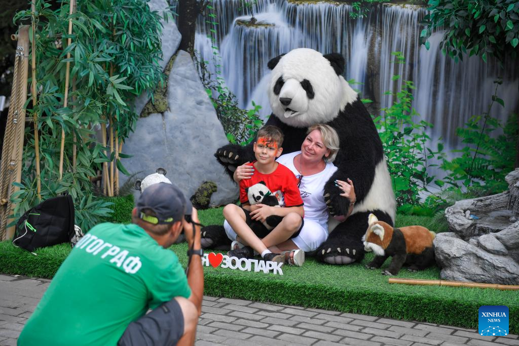 Visitors pose for photos with a giant panda doll at the Moscow Zoo in Moscow, Russia, on July 30, 2025. The Moscow Zoo held an event to celebrate giant panda Dingding's eighth birthday on Wednesday. (Photo by Alexander Zemlianichenko Jr/Xinhua)