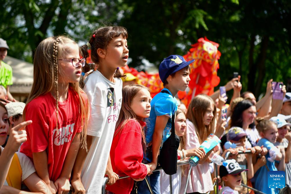 People watch a lion dance during an event for giant pandas at the Moscow Zoo in Moscow, Russia, on July 30, 2025. The Moscow Zoo held an event to celebrate giant panda Dingding's eighth birthday on Wednesday. (Photo by Alexander Zemlianichenko Jr/Xinhua)