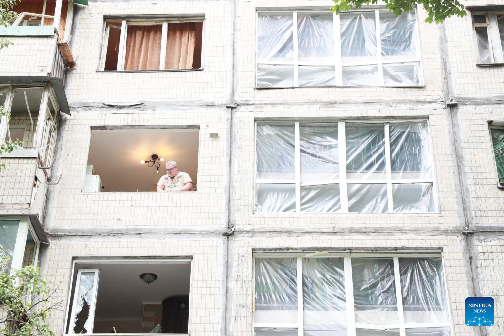 People check the damage after a Russian attack in the Sviatoshinskyi District of Kiev, Ukraine, on July 31, 2025. (Xinhua/Li Dongxu)