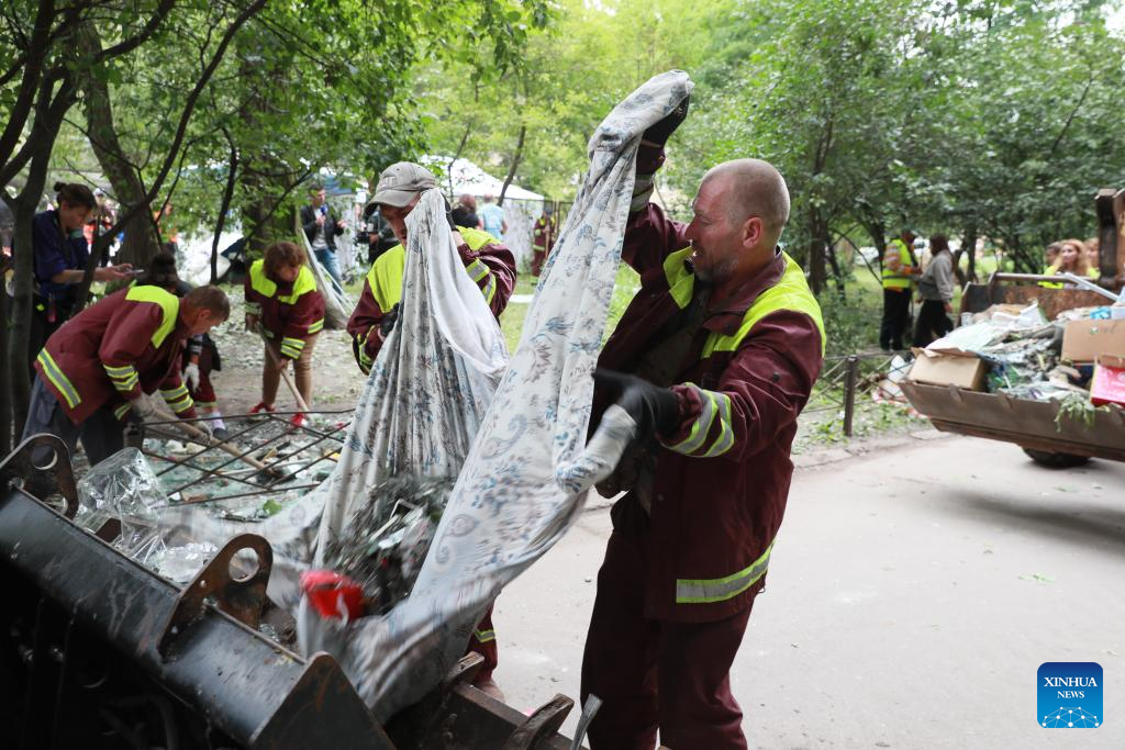 People remove debris after a Russian attack in the Sviatoshinskyi District of Kiev, Ukraine, on July 31, 2025. (Xinhua/Li Dongxu)