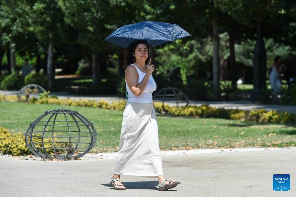 A woman uses an umbrella to shield herself from the sun in Madrid, Spain, Aug. 4, 2025. Heatstroke alerts were issued in many places across Spain as the country is hit by a searing heatwave. (Photo by Gustavo Valiente/Xinhua)
