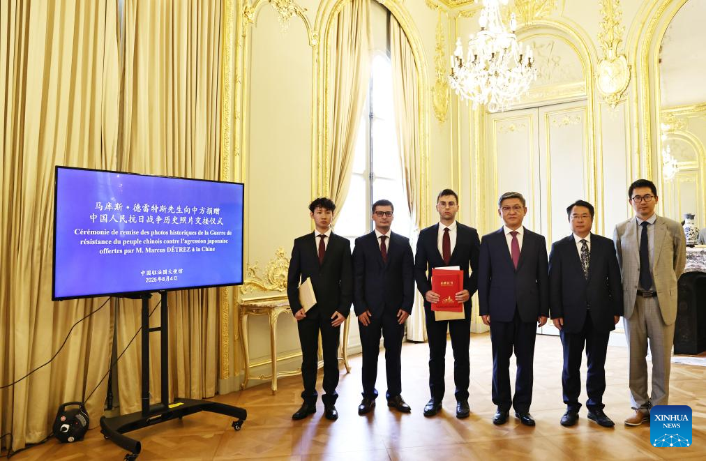 PARIS, Aug. 5 (Xinhua) -- A ceremony for the handover of historical photos taken during the Chinese People's War of Resistance against Japanese Aggression, donated by Marcus Detrez, was held at the Chinese Embassy in France on Monday evening.