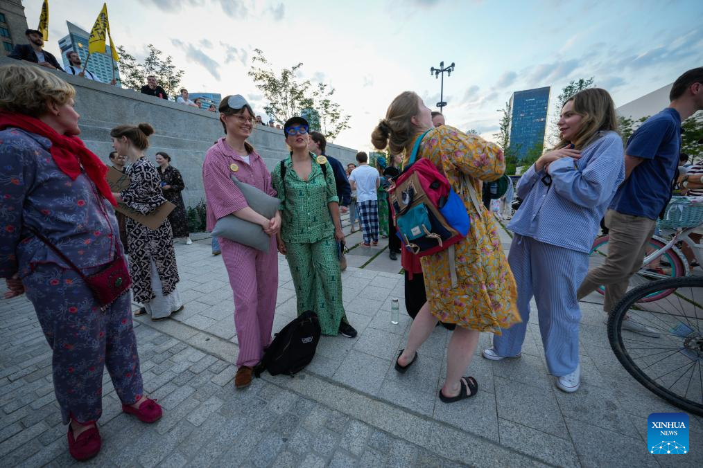 People wearing pajamas are pictured during the "Warsaw doesn't sleep" march in Warsaw, Poland, Aug. 8, 2025. Organized by the local non-profit "The City Is Ours," the event brought together citizens dressed in pajamas and carrying pillows to call for stricter regulations against nighttime noise pollution. (Photo by Jaap Arriens/Xinhua)