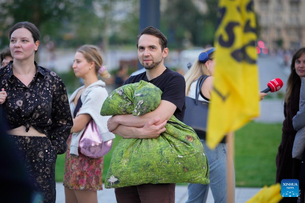 A man holding a pillow is seen during the "Warsaw doesn't sleep" march in Warsaw, Poland, Aug. 8, 2025. Organized by the local non-profit "The City Is Ours," the event brought together citizens dressed in pajamas and carrying pillows to call for stricter regulations against nighttime noise pollution. (Photo by Jaap Arriens/Xinhua)