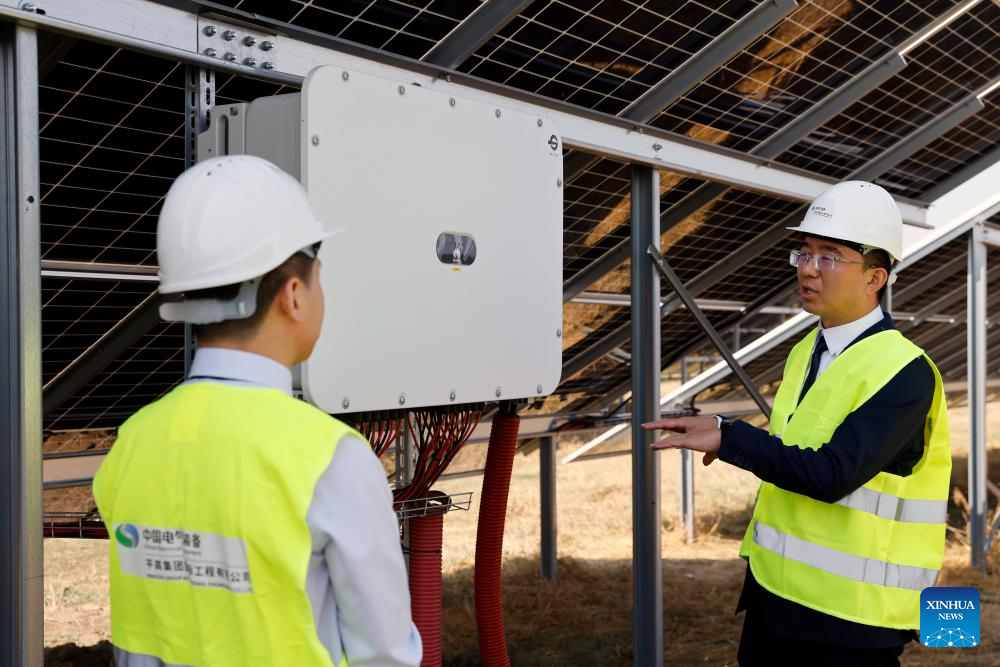 Zhu Jibin (R), general manager of Pinggao Group International Engineering Co., Ltd., communicates with a colleague at a 31.82-megawatt photovoltaic power station in Stefan cel Mare, Calarasi County, Romania, Aug. 12, 2025. (Photo by Cristian Cristel/Xinhua)