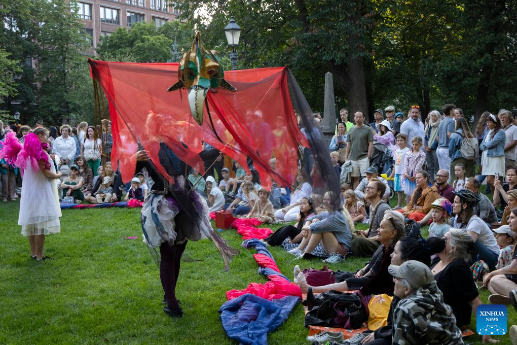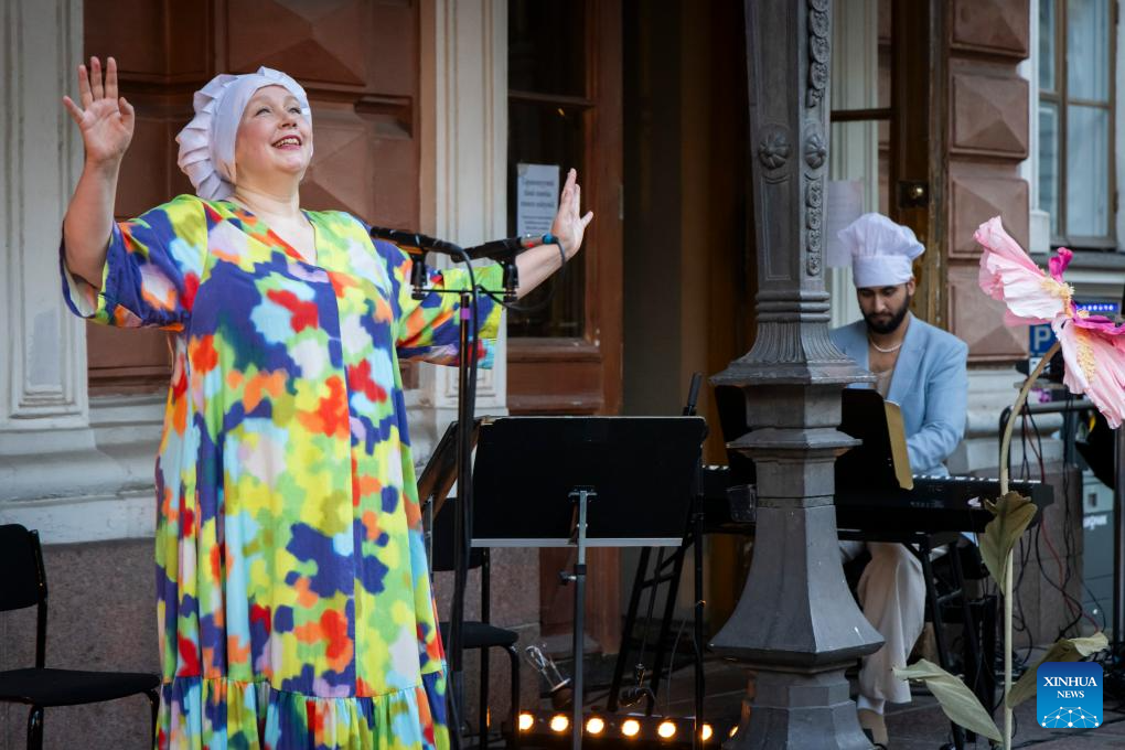 Artists perform during the Night of the Arts in Helsinki, Finland, Aug. 14, 2025. The event was held here on Thursday, featuring more than 370 free art and cultural activities, including music, dance, theater, painting, literature and other art forms. (Photo by Matti Matikainen/Xinhua)