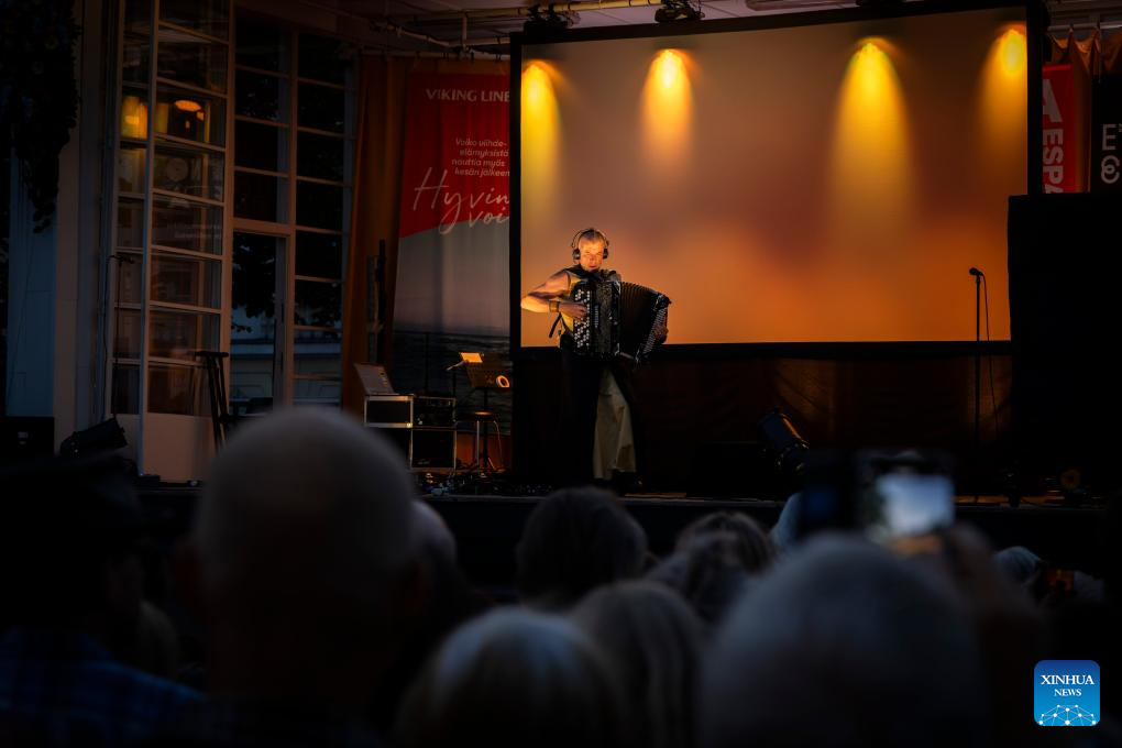 A performer plays the accordion on stage during the Night of the Arts in Helsinki, Finland, Aug. 14, 2025. The event was held here on Thursday, featuring more than 370 free art and cultural activities, including music, dance, theater, painting, literature and other art forms. (Photo by Matti Matikainen/Xinhua)