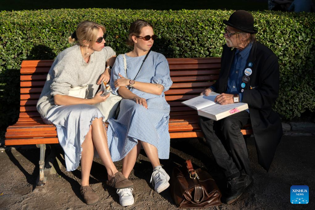 Two women communicate with a poetry enthusiast in a downtown park during the Night of the Arts in Helsinki, Finland, Aug. 14, 2025. The event was held here on Thursday, featuring more than 370 free art and cultural activities, including music, dance, theater, painting, literature and other art forms. (Photo by Matti Matikainen/Xinhua)