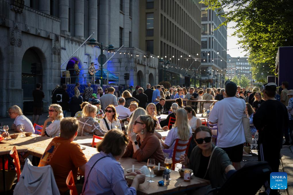 People watch a music performance during the Night of the Arts in Helsinki, Finland, Aug. 14, 2025. The event was held here on Thursday, featuring more than 370 free art and cultural activities, including music, dance, theater, painting, literature and other art forms. (Photo by Matti Matikainen/Xinhua)