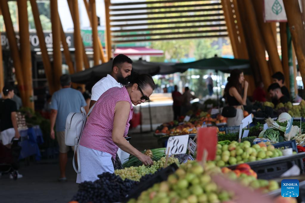 ANKARA, Aug. 15 (Xinhua) -- In the bustling open-air market of capital city Ankara's 100th Yil district, shoppers weave between stalls under a patchwork of canvas awnings, their eyes darting from price tags to their shopping lists.