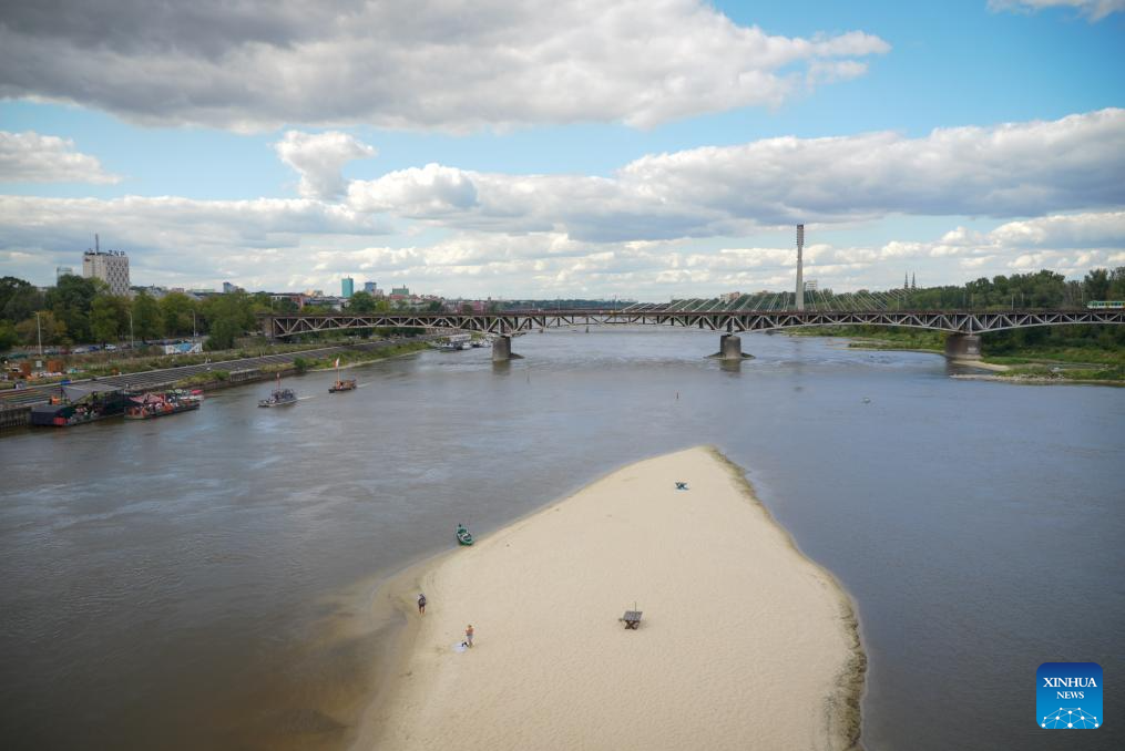 This photo taken on Aug. 17, 2025 shows an exposed sandbank in the Vistula River in Warsaw, Poland. Due to ongoing drought, the water level of the Vistula River has decreased, with exposed riverbeds visible in many sections across the city. (Photo by Jaap Arriens/Xinhua)