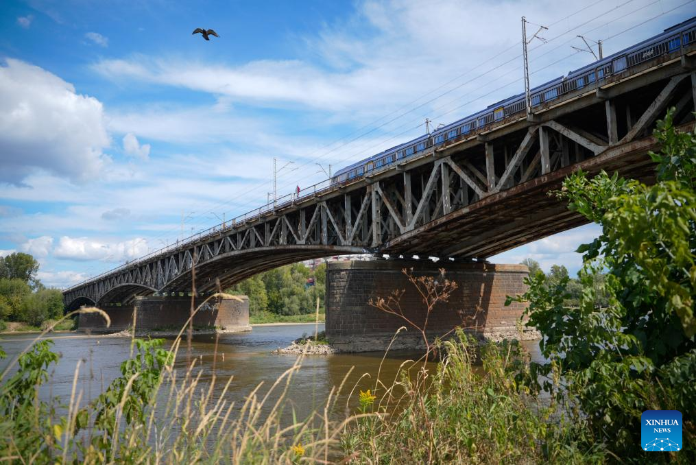 A train crosses a railway bridge over the Vistula River in Warsaw, Poland, on Aug. 17, 2025. Due to ongoing drought, the water level of the Vistula River has decreased, with exposed riverbeds visible in many sections across the city. (Photo by Jaap Arriens/Xinhua)