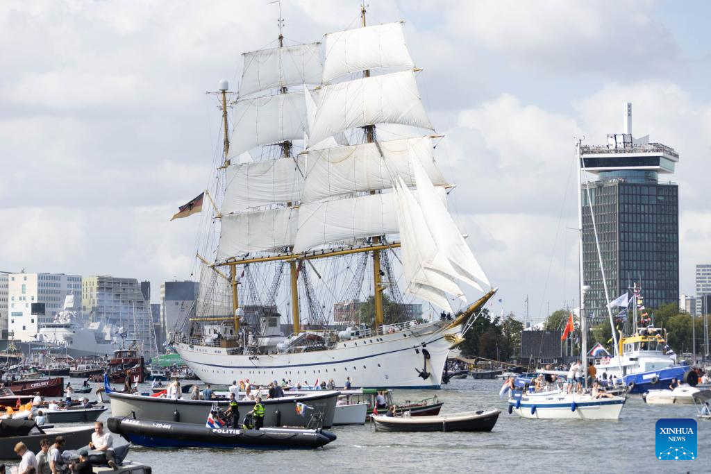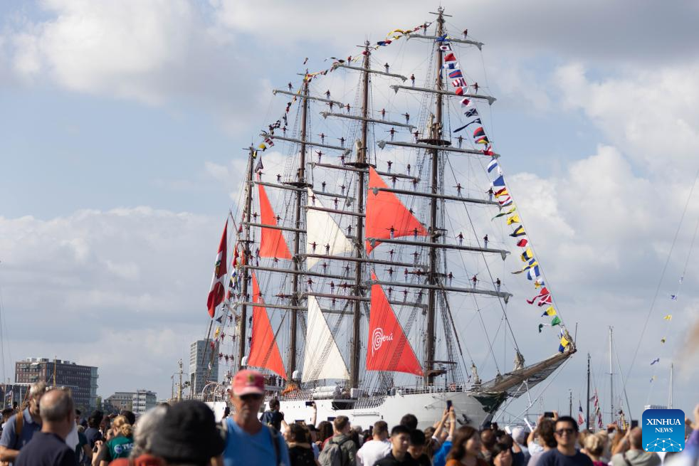 A tall ship sails into Amsterdam, the Netherlands, on Aug. 20, 2025. Sail Amsterdam, the Netherlands' major maritime festival first held 50 years ago, kicked off its 10th edition on Wednesday after a decade-long break. (Photo by Sylvia Lederer/Xinhua)