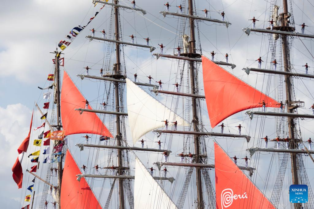 Sailors stand on the masts of a tall ship as it sails into Amsterdam, the Netherlands, on Aug. 20, 2025. Sail Amsterdam, the Netherlands' major maritime festival first held 50 years ago, kicked off its 10th edition on Wednesday after a decade-long break. (Photo by Sylvia Lederer/Xinhua)