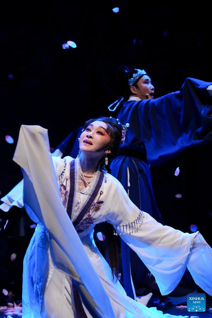 Artists of the Xiaobaihua Yue Opera Troupe from east China's Zhejiang Province perform an excerpt from "The Garden of Love" at Shaw Theatre in London, Britain, on Aug. 21, 2025. (Xinhua/Wu Lu)