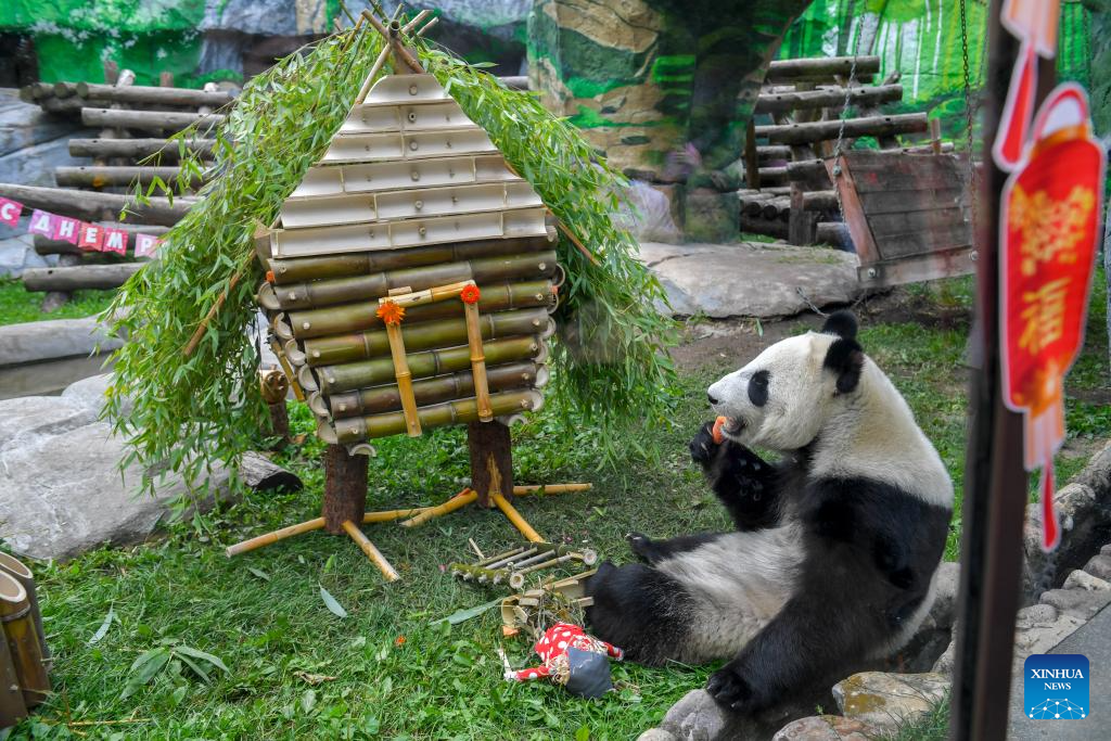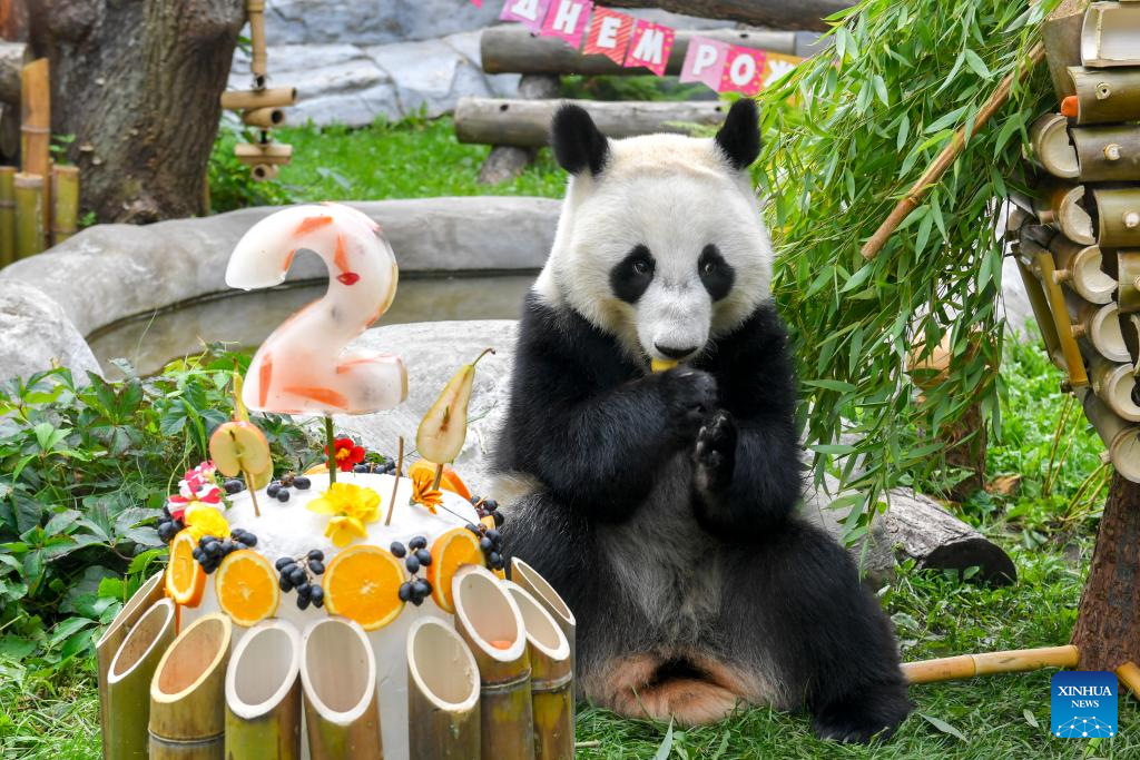 Giant panda Katyusha enjoys the ice birthday cake prepared by the caretakers at Moscow Zoo in Moscow, Russia, Aug. 24, 2025. Katyusha, Russia's first giant panda cub born at Moscow Zoo, celebrated her second birthday on Sunday. (Photo by Alexander Zemlianichenko Jr/Xinhua)