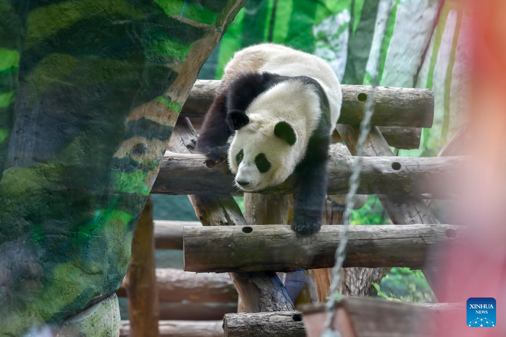 Giant panda Katyusha is pictured at Moscow Zoo in Moscow, Russia, Aug. 24, 2025. Katyusha, Russia's first giant panda cub born at Moscow Zoo, celebrated her second birthday on Sunday. (Photo by Alexander Zemlianichenko Jr/Xinhua)