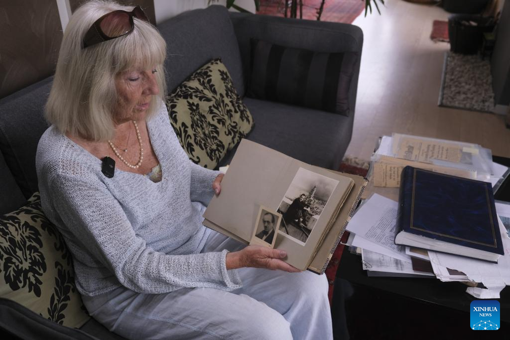 Mariann Stenvig Andersen, niece of Bernhard Sindberg and chairperson of the Sindberg Foundation, shows an album from Bernhard Sindberg during an interview with Xinhua in Aarhus, Denmark, on July 16, 2025.(Xinhua/Zhang Yuliang)