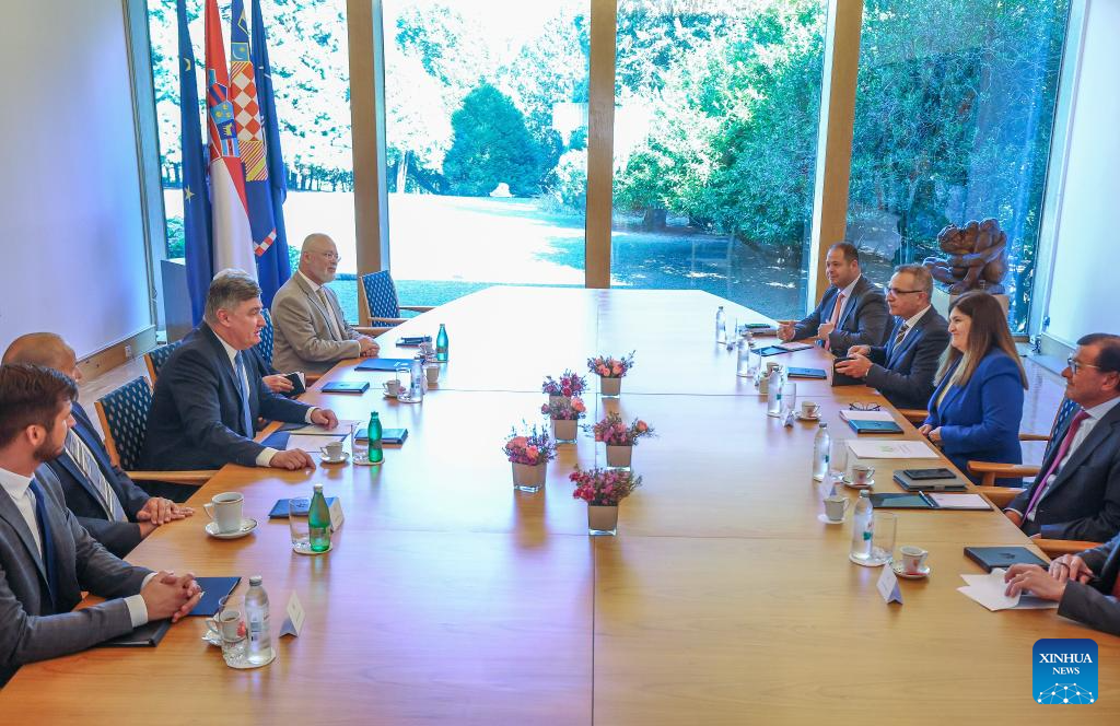 Croatian President Zoran Milanovic (3rd L) meets with Varsen Aghabekian (2nd R), Palestine's minister of state for foreign affairs and expatriates, in Zagreb, Croatia, on Aug. 27, 2025. (Sanjin Strukic/PIXSELL via Xinhua)