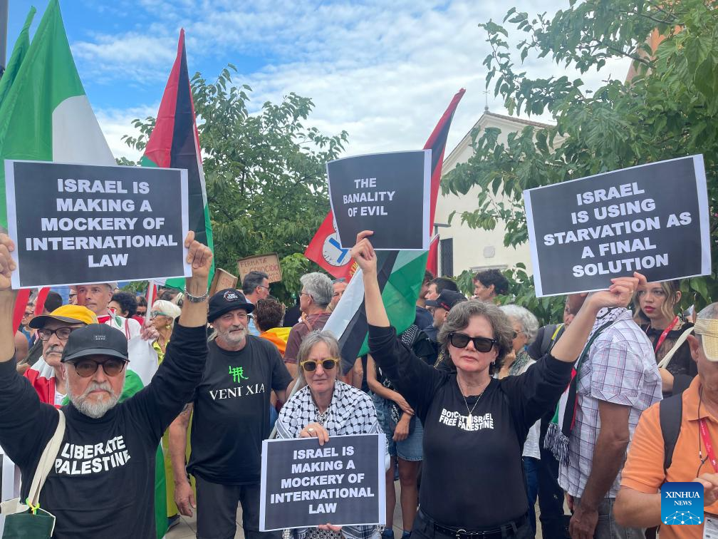 About 5,000 demonstrators marched on Venice's Lido island Saturday during the Venice Film Festival, waving Palestinian flags and banners reading "Stop Genocide" and chanting "Free Palestine." (Xinhua/Li Jing)
