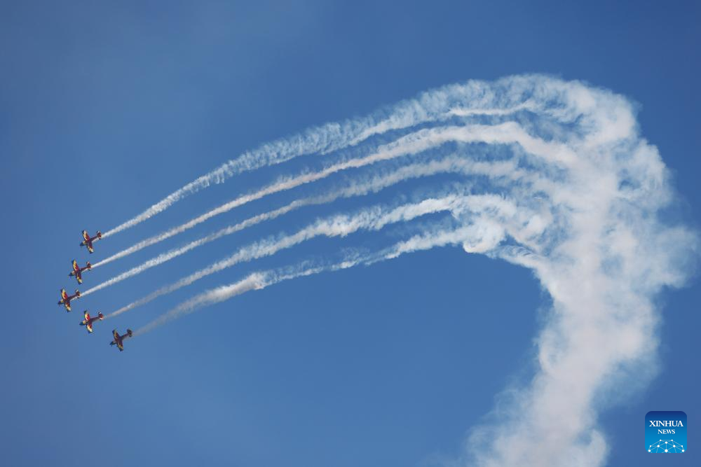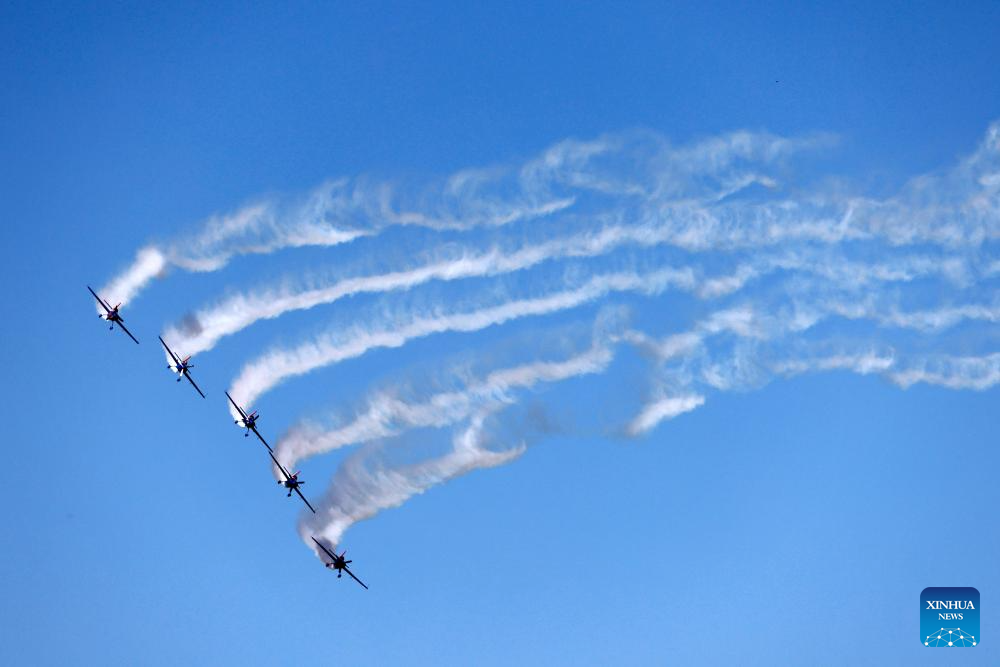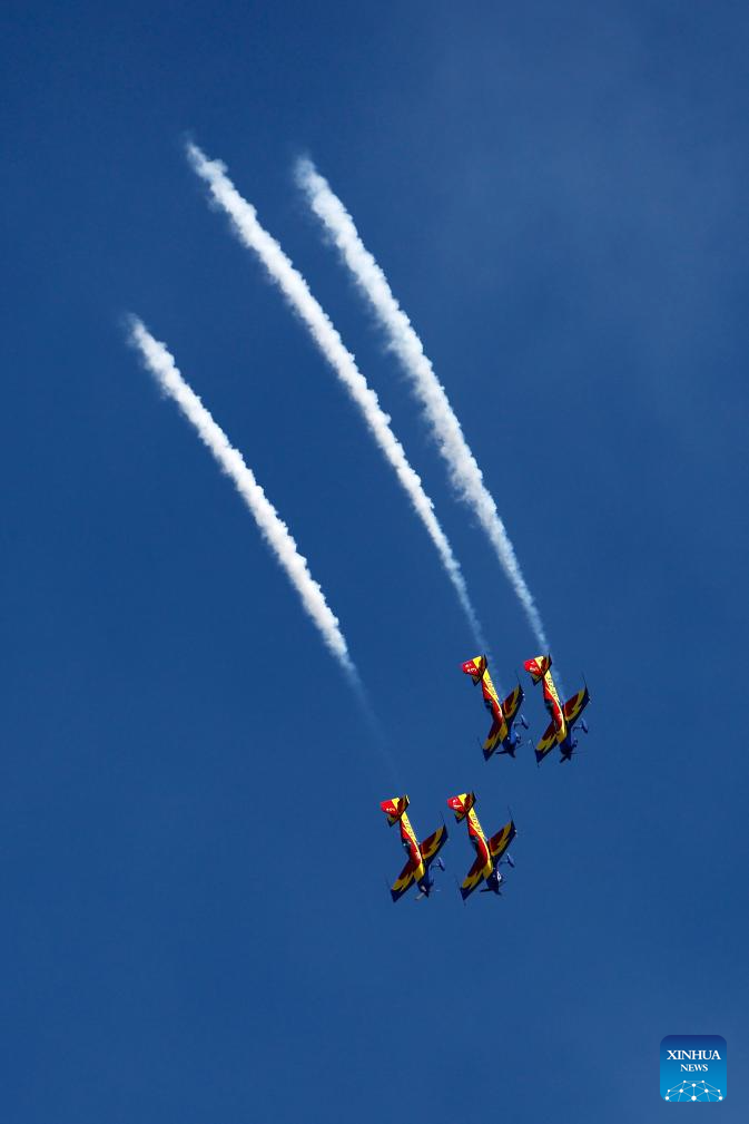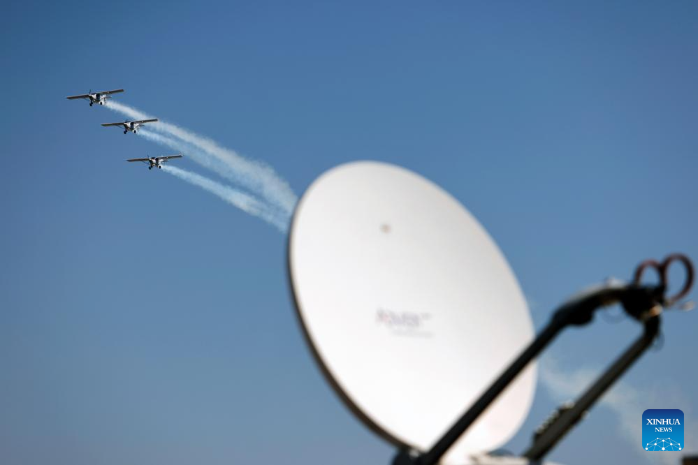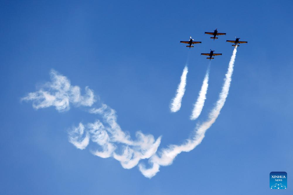 Austrian pilots perform during the Bucharest International Air Show 2025 (BIAS), held at Baneasa airfield in Bucharest, Romania, Aug. 30, 2025. Over 100 civil and military aircraft, as well as over 200 pilots and paratroopers participate in the 15th edition of BIAS, Romania's largest air show. (Photo by Cristian Cristel/Xinhua)