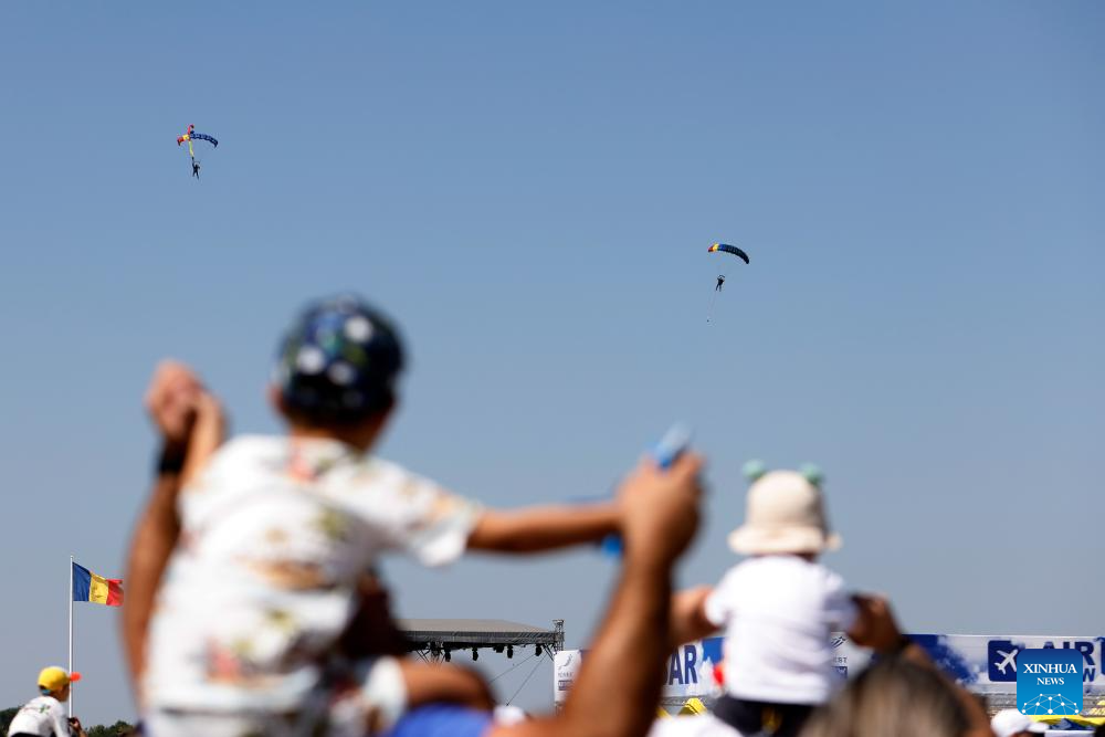 Romanian parachutists descend during the Bucharest International Air Show 2025 (BIAS), held at Baneasa airfield in Bucharest, Romania, Aug. 30, 2025. Over 100 civil and military aircraft, as well as over 200 pilots and paratroopers participate in the 15th edition of BIAS, Romania's largest air show. (Photo by Cristian Cristel/Xinhua)