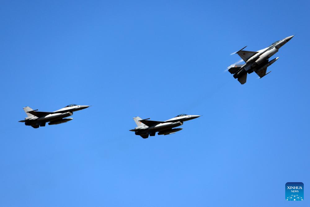 Romanian Air Force military pilots perform on F-16 Fighting Falcon jets during the Bucharest International Air Show 2025 (BIAS), held at Baneasa airfield in Bucharest, Romania, Aug. 30, 2025. Over 100 civil and military aircraft, as well as over 200 pilots and paratroopers participate in the 15th edition of BIAS, Romania's largest air show. (Photo by Cristian Cristel/Xinhua)
