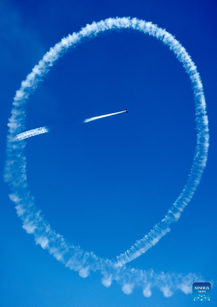 Members of Hawks of Romania aerobatic team perform on Extra-330 airplanes during the Bucharest International Air Show 2025 (BIAS), held at Baneasa airfield in Bucharest, Romania, Aug. 30, 2025. Over 100 civil and military aircraft, as well as over 200 pilots and paratroopers participate in the 15th edition of BIAS, Romania's largest air show. (Photo by Cristian Cristel/Xinhua)