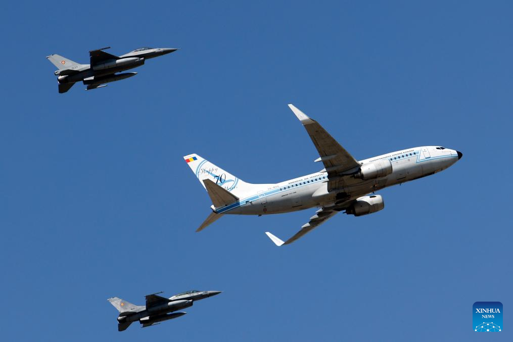Romanian Air Force military pilots on F-16 Fighting Falcon jets escort a Boeing 737 of Romanian flag carrier Tarom during the Bucharest International Air Show 2025 (BIAS), held at Baneasa airfield in Bucharest, Romania, Aug. 30, 2025. Over 100 civil and military aircraft, as well as over 200 pilots and paratroopers participate in the 15th edition of BIAS, Romania's largest air show. (Photo by Cristian Cristel/Xinhua)