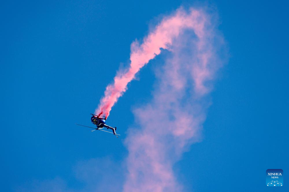 An Austrian pilot performs on BO-105 helicopter during the Bucharest International Air Show 2025 (BIAS), held at Baneasa airfield in Bucharest, Romania, Aug. 30, 2025. Over 100 civil and military aircraft, as well as over 200 pilots and paratroopers participate in the 15th edition of BIAS, Romania's largest air show. (Photo by Cristian Cristel/Xinhua)