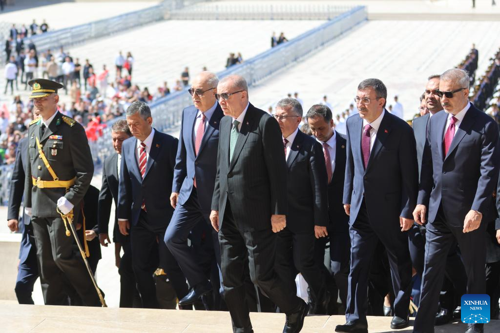 Turkish President Recep Tayyip Erdogan attends a ceremony marking Aug. 30 Victory Day at the Ataturk Mausoleum in Ankara, Türkiye, on Aug. 30, 2025. (Mustafa Kaya/Handout via Xinhua)