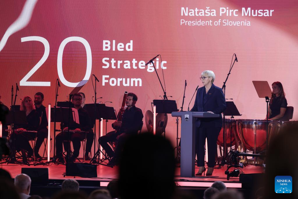 Slovenian President Natasa Pirc Musar (2nd R) addresses the opening session of the Bled Strategic Forum in Bled, Slovenia, Sept. 1, 2025. This year marks the 20th edition of the Bled Strategic Forum, held under the theme "A Runaway World." European Council President Antonio Costa, Slovenian President Natasa Pirc Musar and Slovenian Foreign Minister Tanja Fajon on Monday urged peace in Gaza during the Bled Strategic Forum, Slovenia's most prominent foreign policy gathering. (Photo by Zeljko Stevanic/Xinhua)