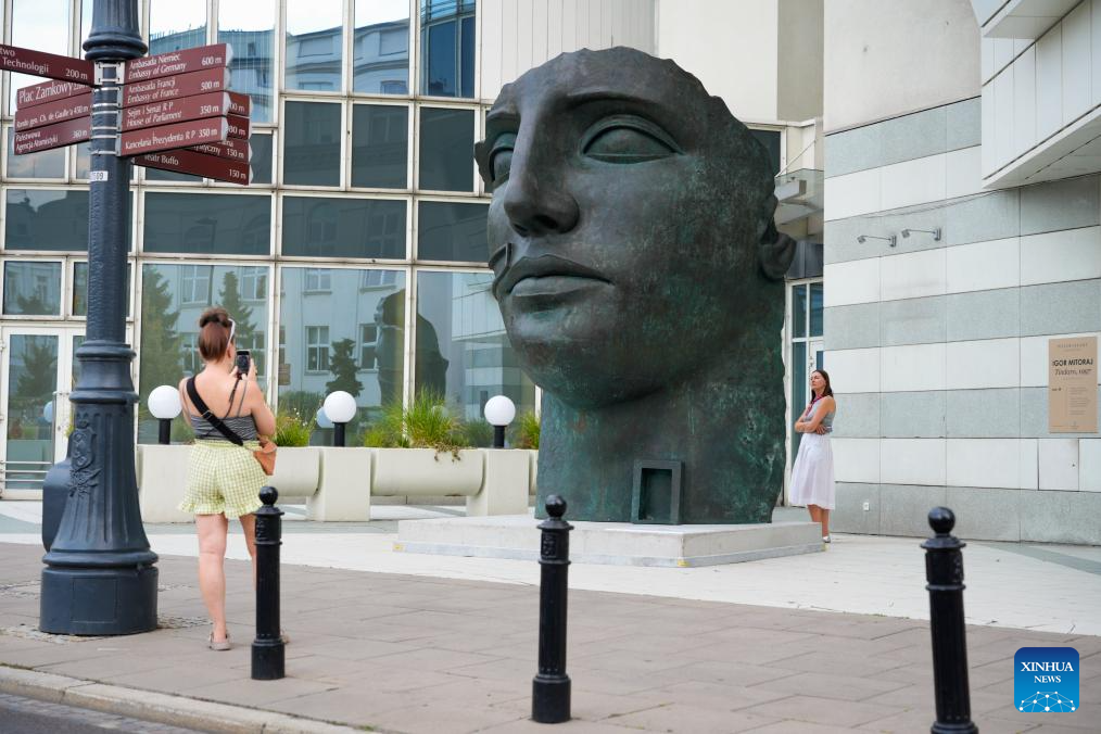 People take photos with the sculpture Tindaro in Warsaw, Poland, Sept. 5, 2025. Tindaro, created in 1997 by renowned Polish sculptor Igor Mitoraj (1944-2014), has been transported from Paris to Warsaw and is now on displayed in the city center. Mitoraj was internationally acclaimed for his monumental fragmented human figures. (Photo by Jaap Arriens/Xinhua)