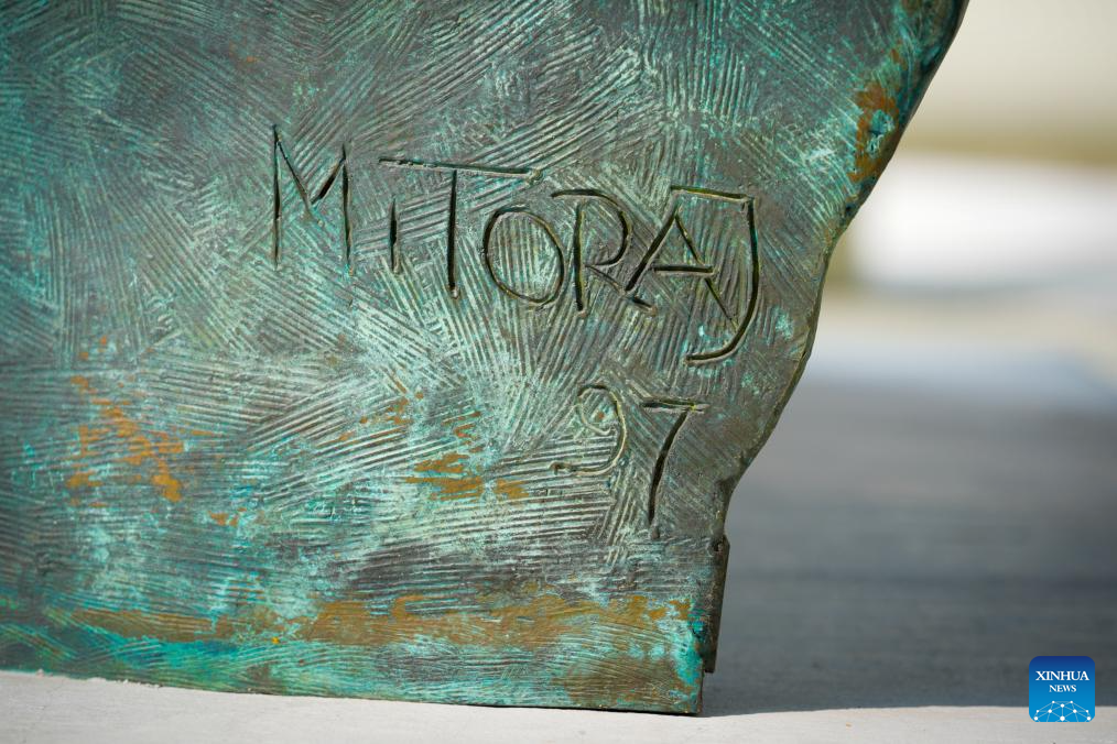 The artist's signature is seen on the sculpture Tindaro in Warsaw, Poland, Sept. 5, 2025. Tindaro, created in 1997 by renowned Polish sculptor Igor Mitoraj (1944-2014), has been transported from Paris to Warsaw and is now on displayed in the city center. Mitoraj was internationally acclaimed for his monumental fragmented human figures. (Photo by Jaap Arriens/Xinhua)