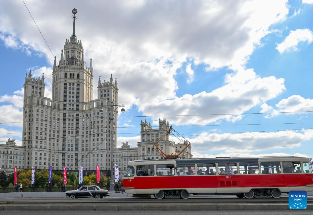 Vintage vehicles are seen during a parade in Moscow, Russia, Sept. 6, 2025. A vintage vehicle parade was held here on Saturday, showcasing various vintage vehicles, including cars and trams. (Xinhua/Hao Jianwei)
