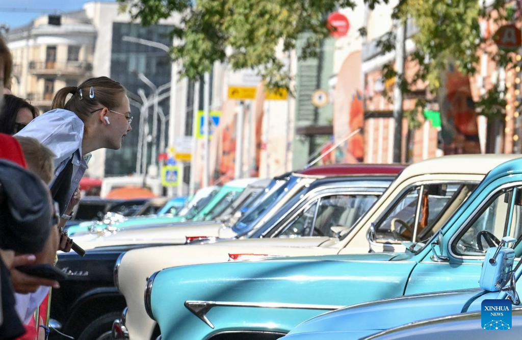 People view vintage vehicles in Moscow, Russia, Sept. 6, 2025. A vintage vehicle parade was held here on Saturday, showcasing various vintage vehicles, including cars and trams. (Xinhua/Hao Jianwei)