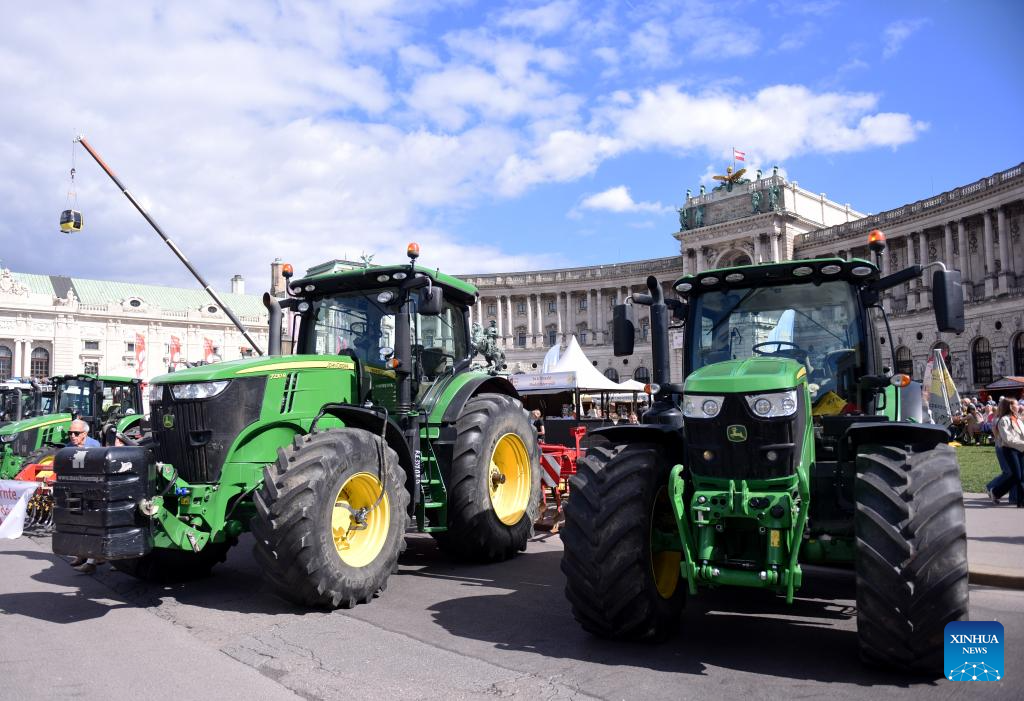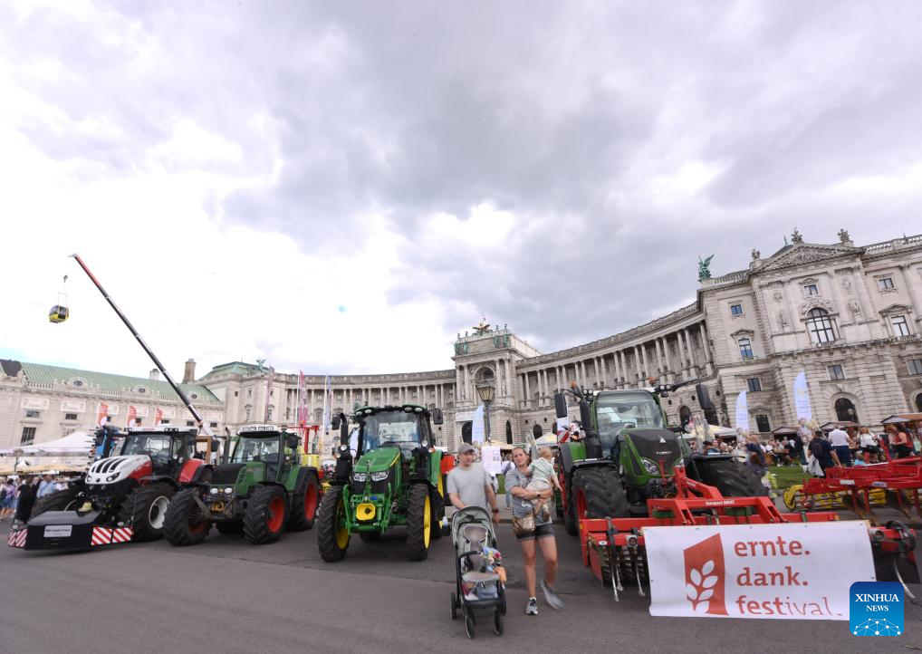 This photo taken on Sept. 6, 2025 shows agricultural machinery during a harvest festival (the Erntedankfest) in Vienna, Austria. The festival was held in Vienna on Sept. 6 to 7. (Xinhua/He Canling)