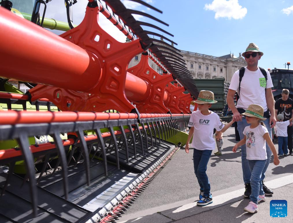 People watch agricultural machinery during a harvest festival (the Erntedankfest) in Vienna, Austria, Sept. 6, 2025. The festival was held in Vienna on Sept. 6 to 7. (Xinhua/He Canling)