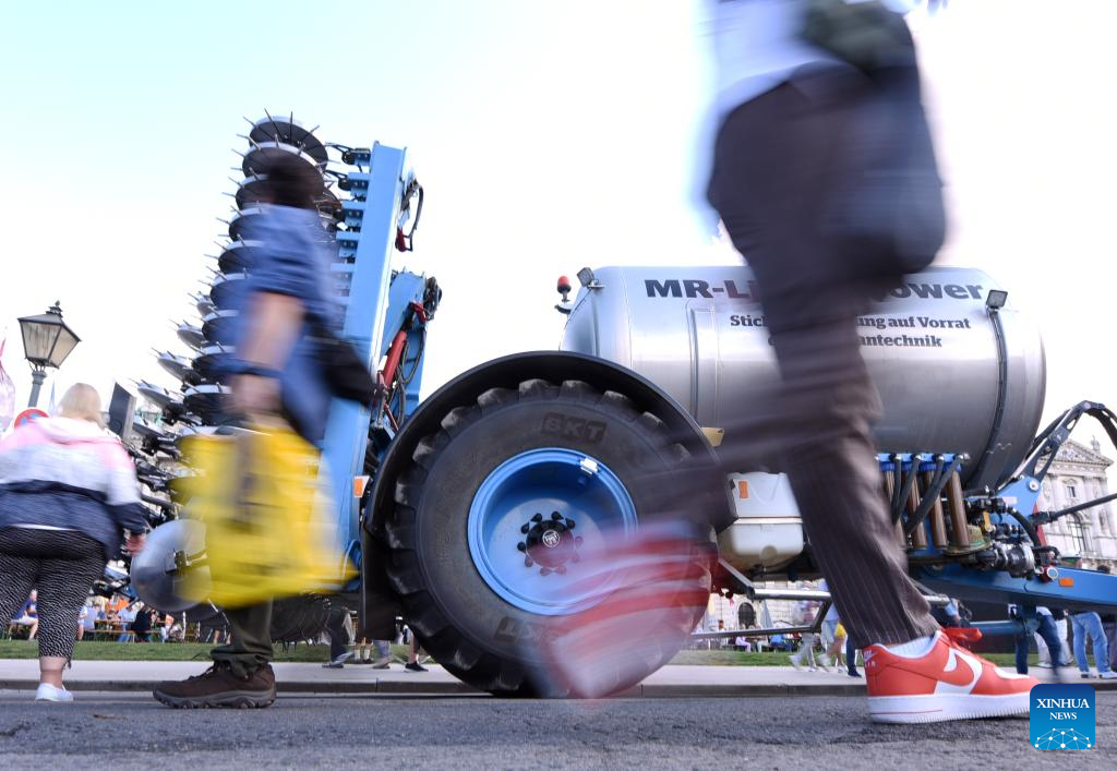 A visitor watches agricultural machinery during a harvest festival (the Erntedankfest) in Vienna, Austria, Sept. 6, 2025. The festival was held in Vienna on Sept. 6 to 7. (Xinhua/He Canling)