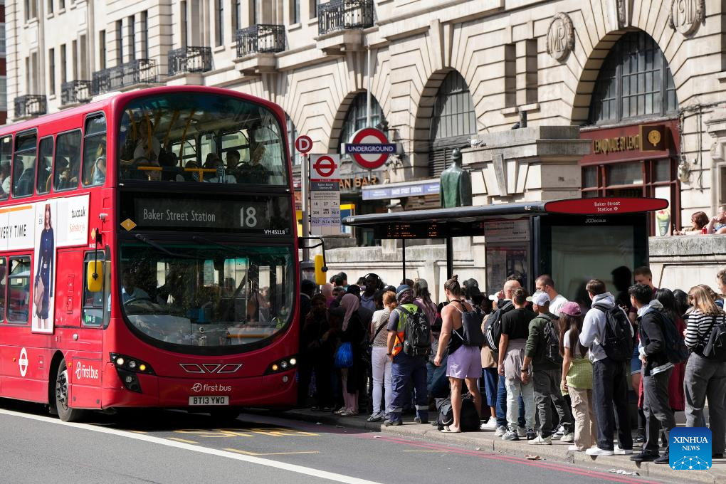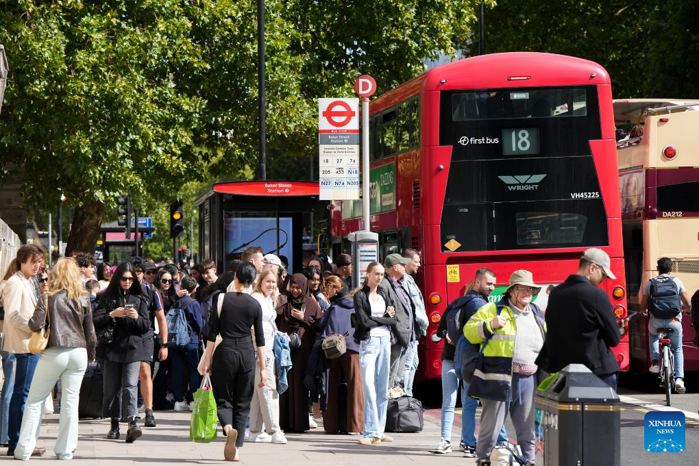 Passengers transfer to other modes of transportation at a bus stop near Baker Street Station on the London Underground in London, Britain, Sept. 8, 2025, London is facing transport chaos as members of the Rail, Maritime and Transport (RMT) union stage a series of strikes. The strikes are scheduled for September 7 to 12, resulting in an early shutdown of services on Sunday evening and a four-day closure of the entire London Underground network starting Monday. (Xinhua/Wu Lu)