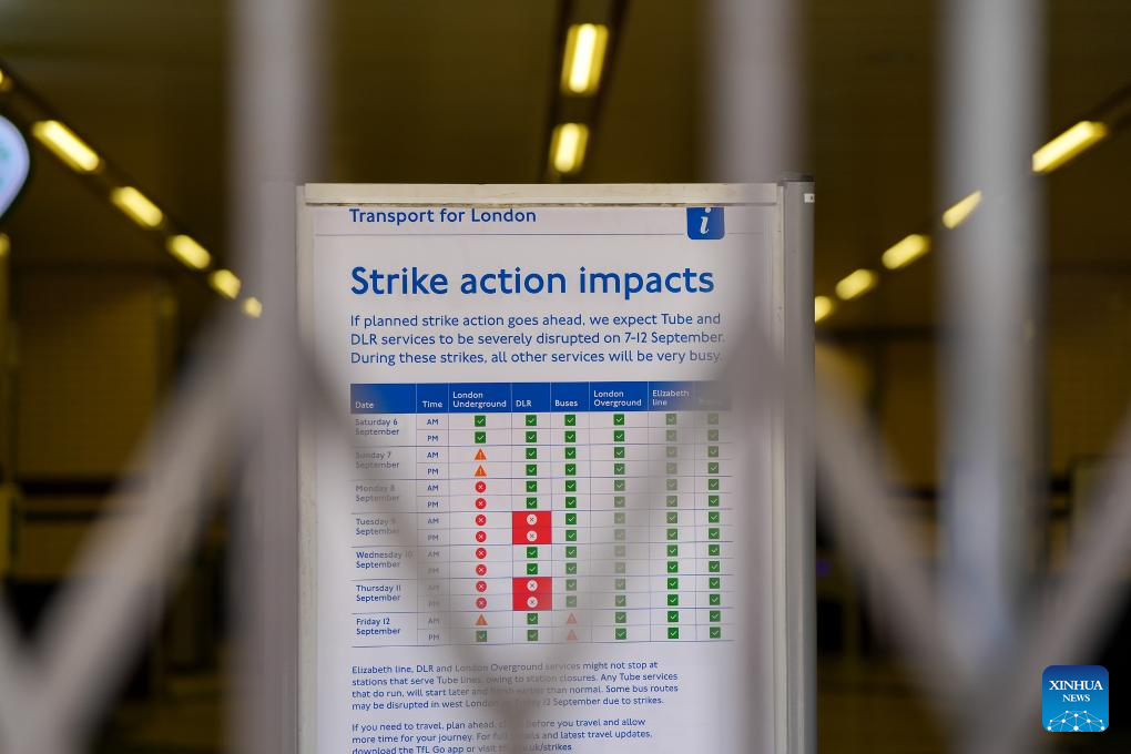 The strikes are scheduled for September 7 to 12, resulting in an early shutdown of services on Sunday evening and a four-day closure of the entire London Underground network starting Monday. (Xinhua/Wu Lu)