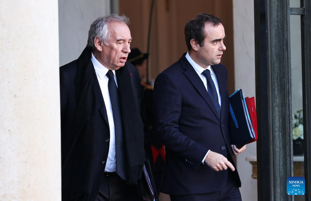Photo taken on Jan. 3, 2025 shows French Prime Minister Francois Bayrou (L) and Defense Minister Sebastien Lecornu leaving the Elysee Palace in Paris. French President Emmanuel Macron nominated Defense Minister Sebastien Lecornu as the new prime minister, Sept. 9, 2025. (Xinhua/Gao Jing)