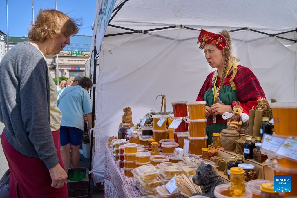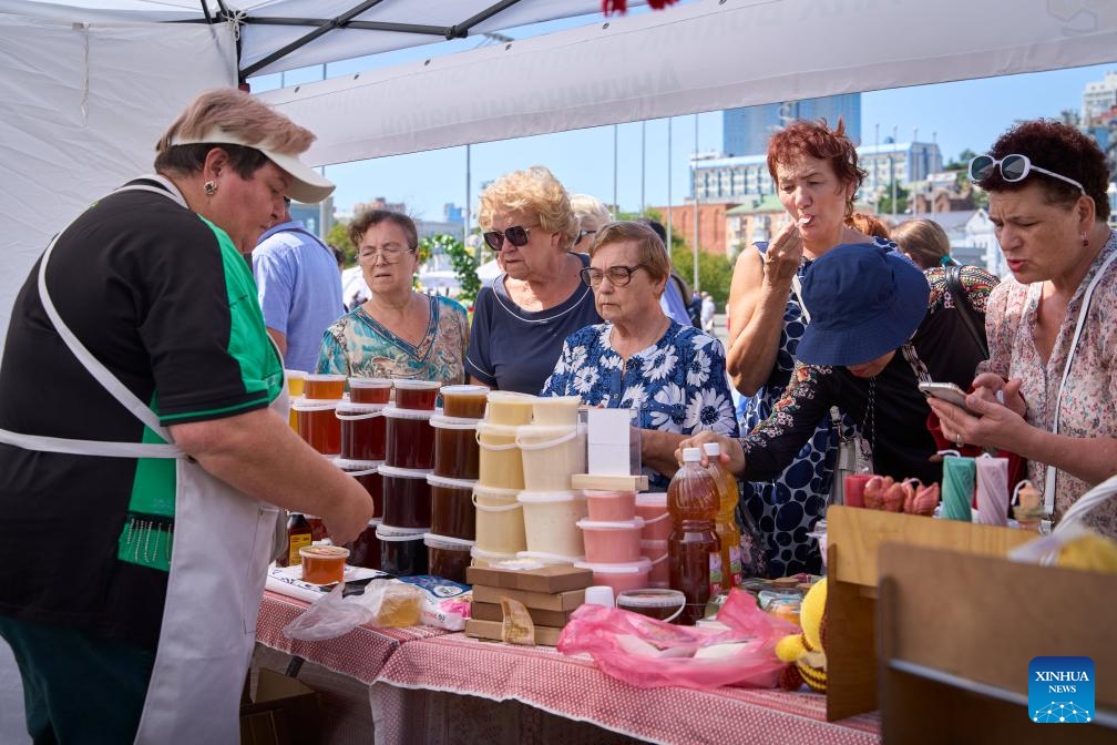 Visitors view honey products during the "Honey Day" event in Vladivostok, Russia, Sept. 11, 2025. (Photo by Guo Feizhou/Xinhua)