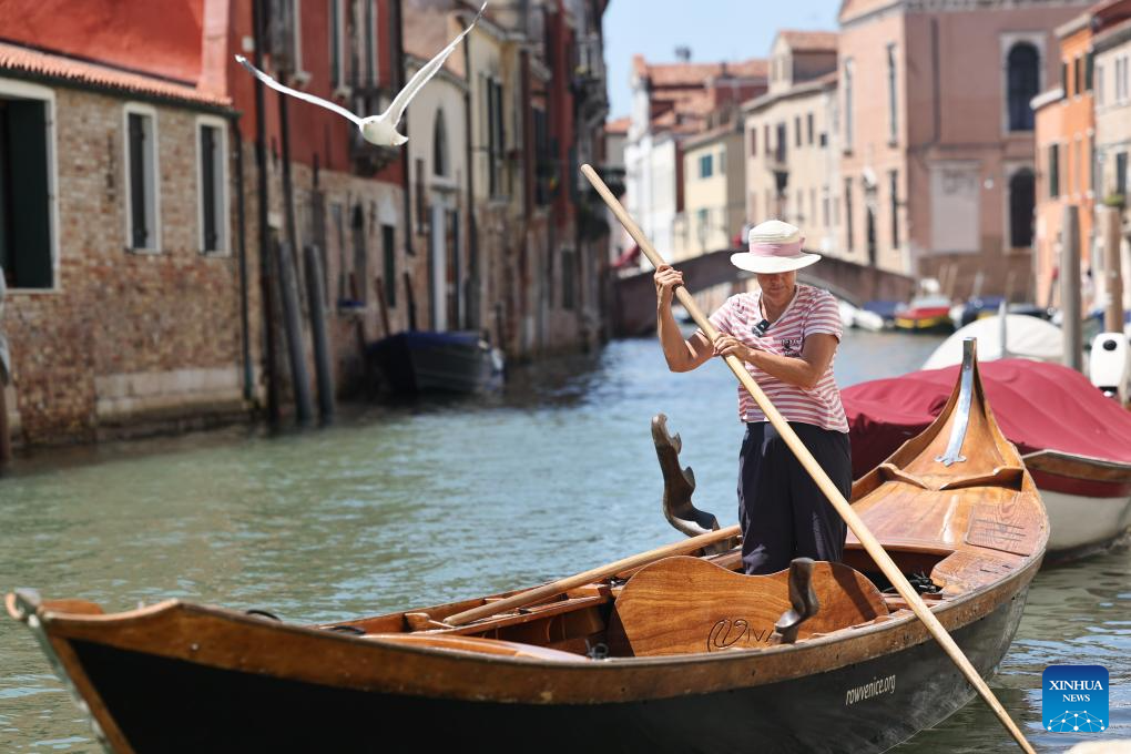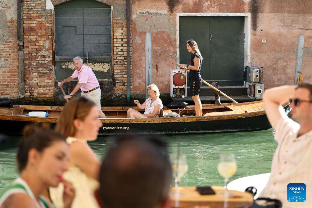 Jane Caporal rows a shrimp-tailed batela on the Grand Canal of Venice, Italy, July 17, 2025.(Xinhua/Li Jing)