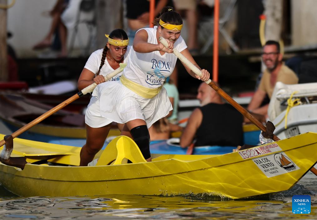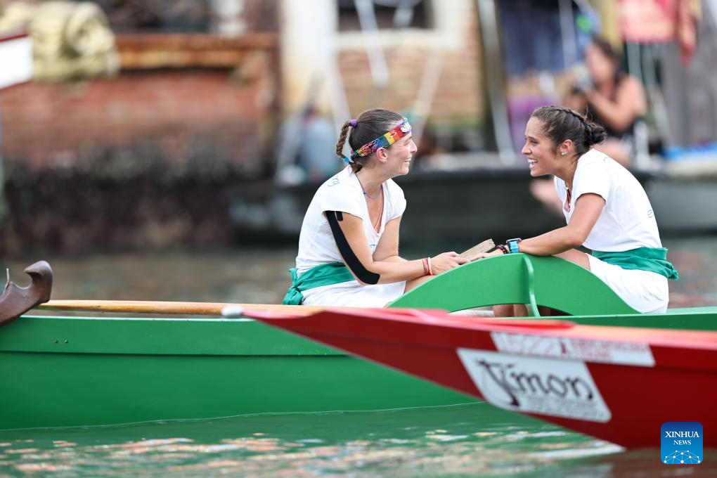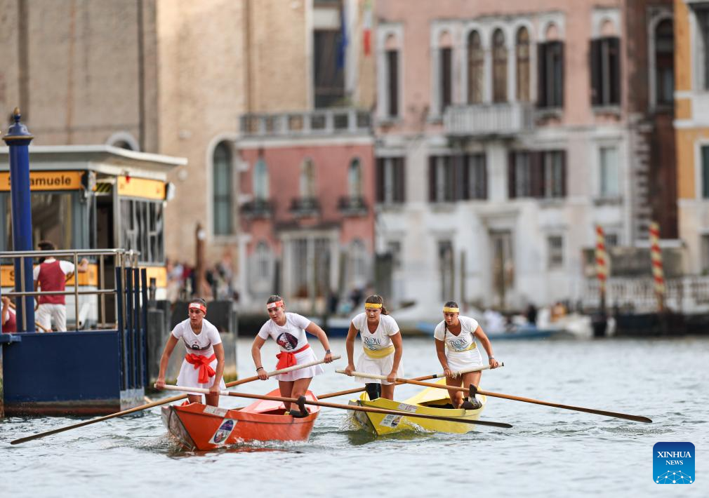 Female rowers practice before the Regata Storica boat race in Venice, Italy, Sept. 4, 2025.(Xinhua/Li Jing)